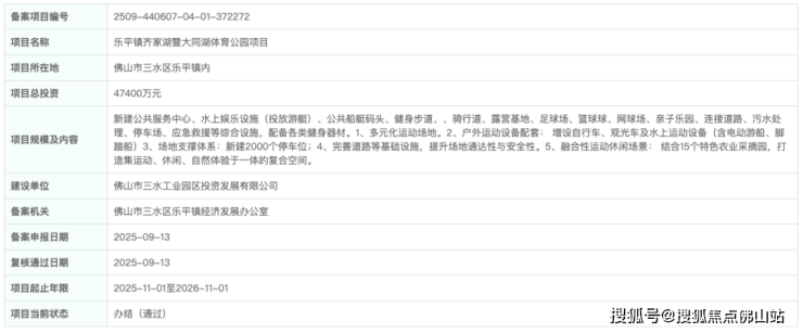 广东省项目在线审批监管平台显示,三水乐平镇齐家湖建大同湖体育公园项目通过备案,总投资4.74亿元。